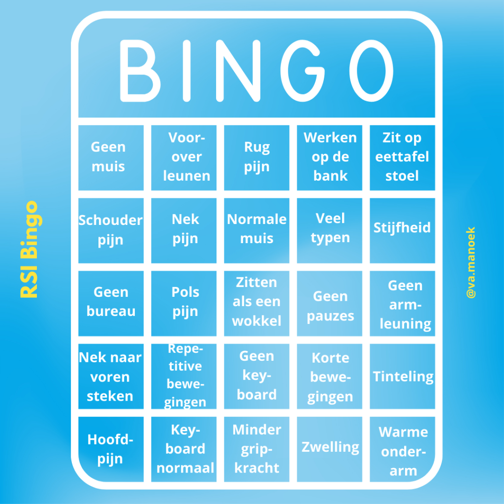 Om je te helpen herkennen van mogelijke RSI-symptomen en -oorzaken, hier is een speelse “RSI Bingo”.